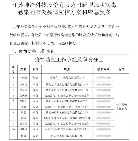 积极响应政府号召,第一时间发布《江苏坤泽科技股份有限公司新型冠状病毒感染的肺炎疫情防控方案和应急预案》。